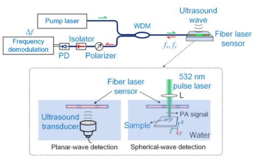 如下图所示为一种用于声波探测的高频光纤激光传感器[12],超声波能够使光纤激光腔发生形变,引起外差输出信号的频率变化。传感器在22MHz处发生频率响应,其宽带声学传感灵敏度为2.25MHz/kPa,当采样率为100 MHz时,噪声当量压力达到45Pa。其针对球面波的检测带宽达到18 MHz。沿光纤纵向的灵敏度随激光空间模式而变化,并由光栅和腔这两个参数决定。在径向方向上,灵敏度与声源和检测器之间的距离的平方根成反比。通过减小腔的长度可以增强声学灵敏度,短腔可以显著提高传感器的光生显微镜(PAM)对比度和穿透深度。